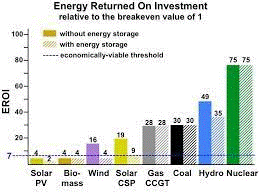 If we assume L = 45 years and I = $2, the EROI value of 75 given in Figure 1 for nuclear implies an electricity price of $0.42 per kwh in this analysis. With P = 0.42, EROI of 4, and L = 20 years we get an investment cost (I) of $16.6/watt for solar PV. The value for EROI was obtained from a 2013 paper which used information from 2005-8. Solar PV investment costs in 2010 were more than $5/watt and rapidly declining, suggesting that were much higher before 2010. Given much lower investment costs today, EROI for solar PV is likely to be correspondingly higher. As more operating experience has accumulated, the expected lifetime of solar PV has also lengthened, which is another reason to believe EROI for solar PV today is quite a bit higher than 4.