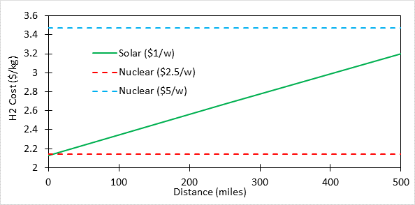 American demand for aviation fuel in 2019 was 18.3 billion gallons (6 billion kg). Just based on the stoichiometry, it would take at least 2.6 billion kg/yr of hydrogen to produce this much fuel. A minimum of 18 GW of electrical capacity would be needed which translates to some 150 square miles of solar farms in an optimal siting. Alternately, 4-5 large nuclear plants could manage the whole thing. The example I had the mind was wells located in Southwestern Texas, around 500 miles from end users in the Houston area petrochemical industrial complex, or perhaps in much closer Midland TX. I compared the cost of hydrogen produced from solar PV as a function of distance from use point with hydrogen produced from nuclear power constructed at the point of use with the results shown in Figure 2 below.